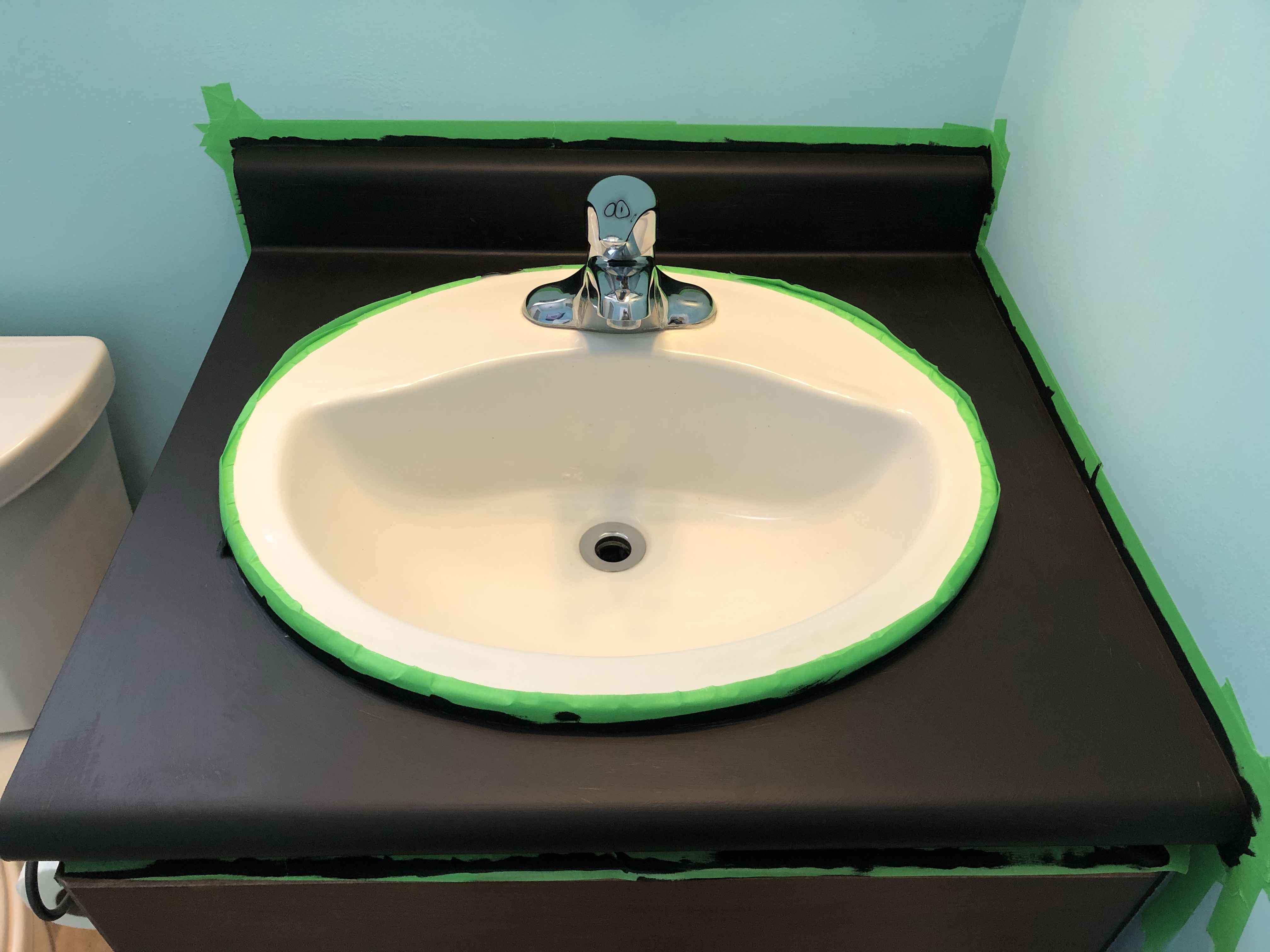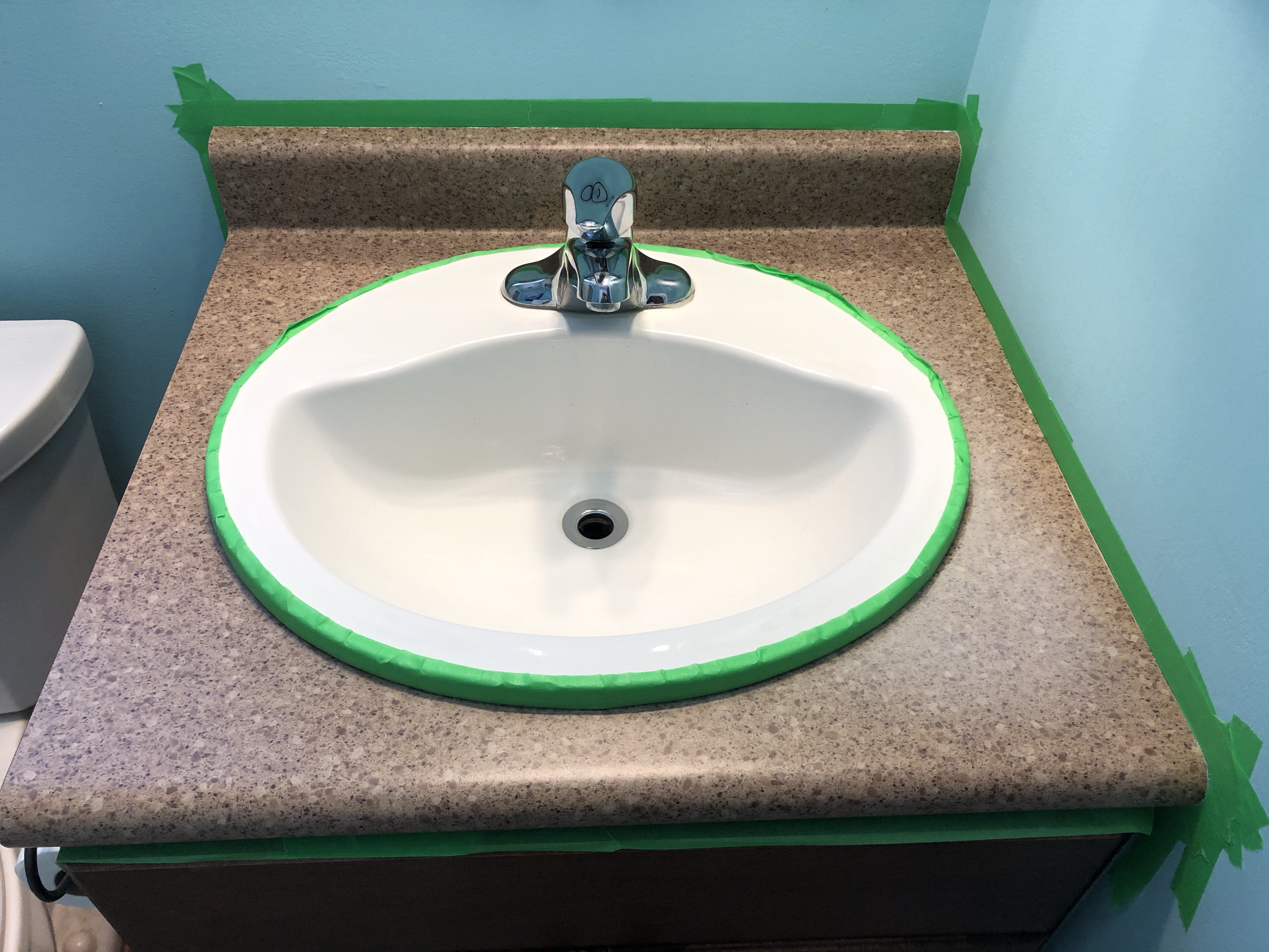 I had a weekday off and I knew the kids had school work, so I decided to tackle it. The first step was to remove all the old caulking and give the counter a good cleaning / sos scrubbing. Next, the area had to be taped off and then I could apply the first layer of primer. It went on super easy and quick.