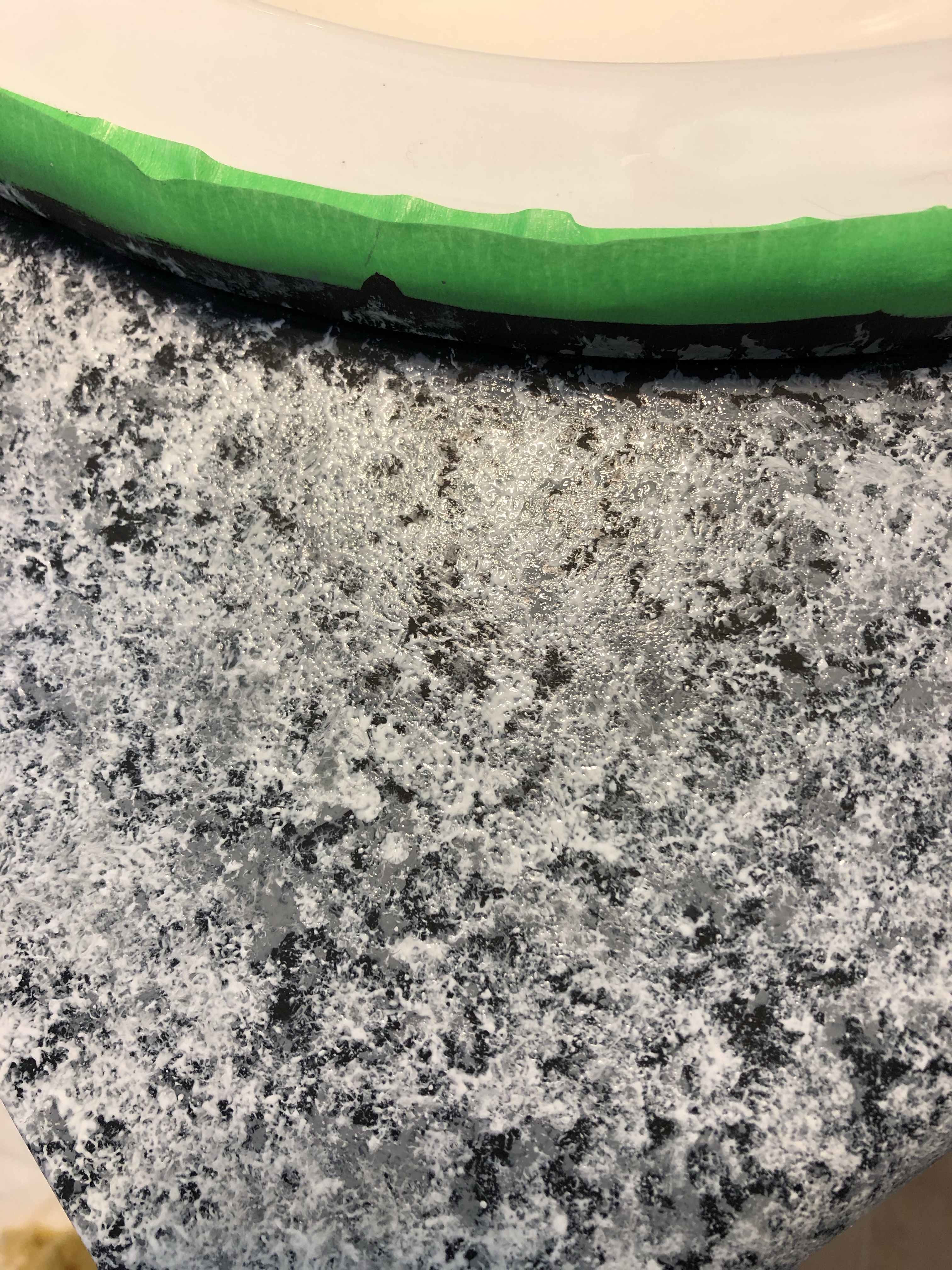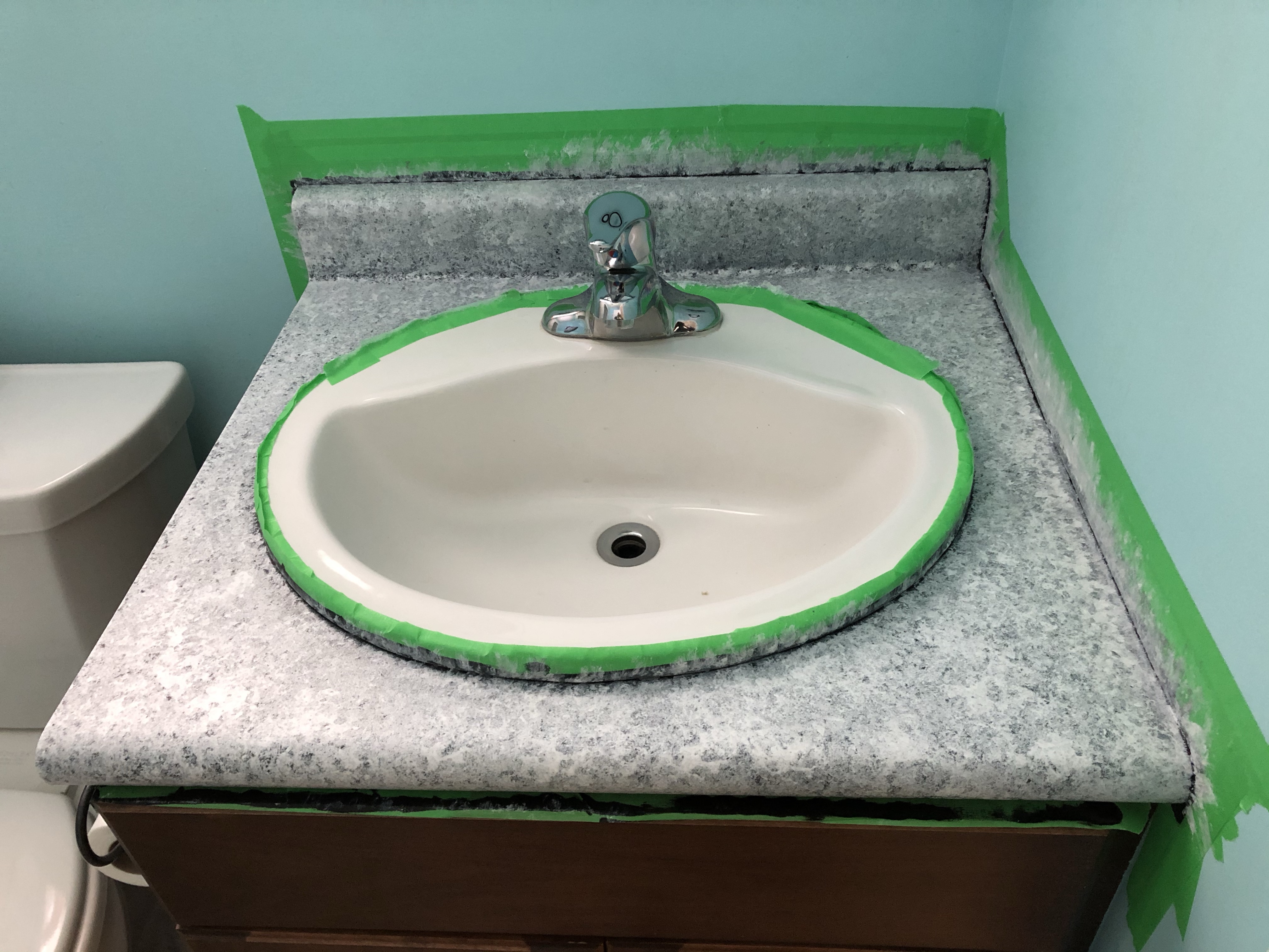 Next, it had to sit for 8 hours, so I decided to leave it and start the marble effect the next day. They give you multiple colors of paint depending on the color effect you want. I wanted more of a lighter color to go with the blue walls and dark cupboard. I put my first color on, which was a medium grey with a sponge. They give you a big sponge that you cut into pieces to use to create the marble effect. After the grey, I had 2 types of white that came on next. You work in a 2ft space at a time.