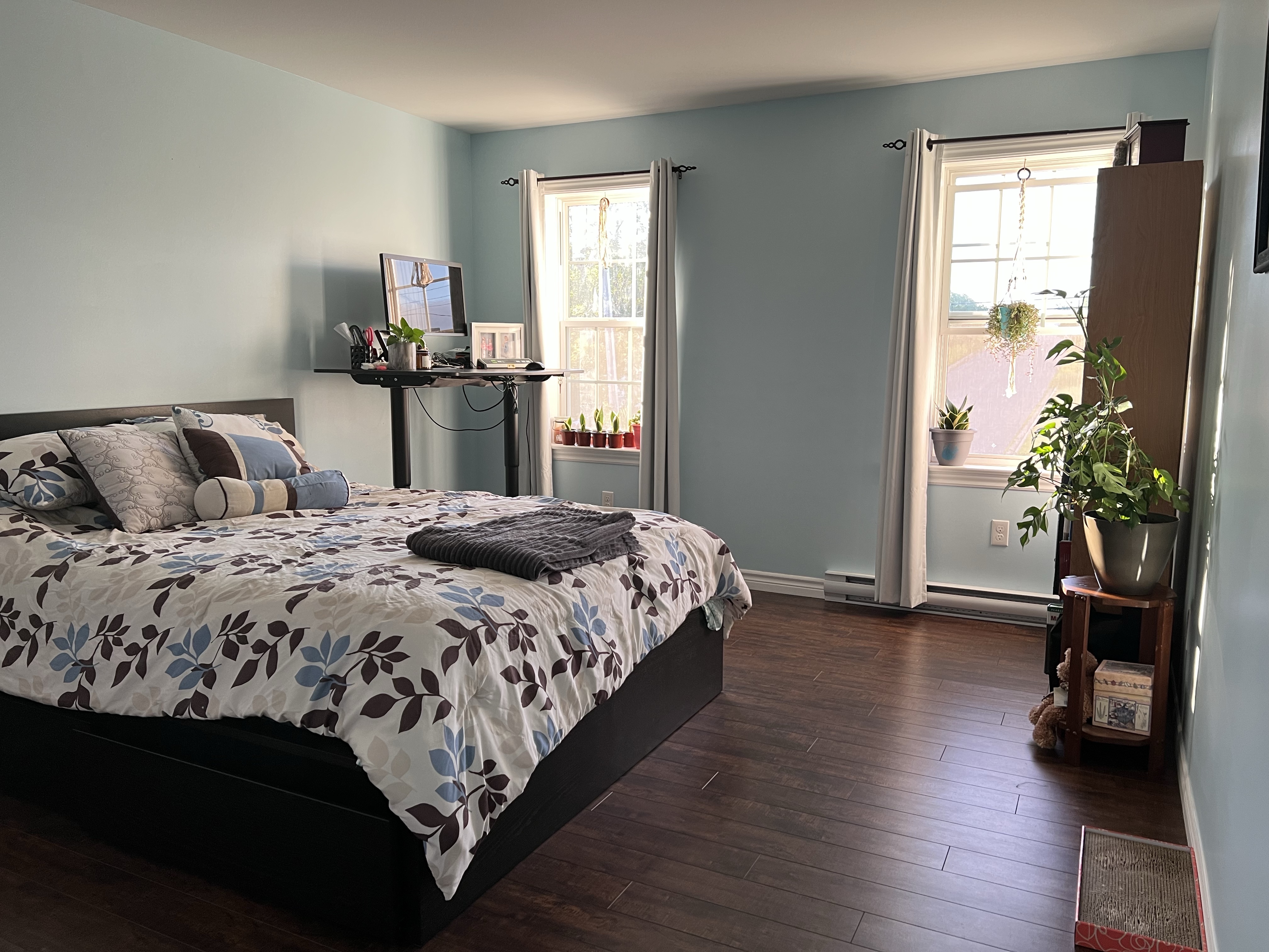 I squeezed in a couple of final painting projects. My bedroom was something I really wanted painted before I went back. It was a medium blue and we had dark chocolate curtains. I work from my room for part of my day and often found it too dark. I wanted a brighter change. During our getaway (Sandy and I’s first night away without kids in a super long time), the room we stayed in was a pale blue, with beach prints around it. So pretty and bright. I came home and found a similar color. We bought new white curtains and the room looks so different. I still need to get some prints for the walls and a new comforter, but I am excited to return to work in a brighter space. I also painted our hallway end table with chalk paint. I love that stuff. I will definitely do a few other things around the house in the coming months.